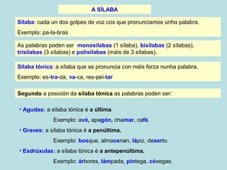 Sílaba tónica: a sílaba que se pronuncia con máis forza nunha palabra.