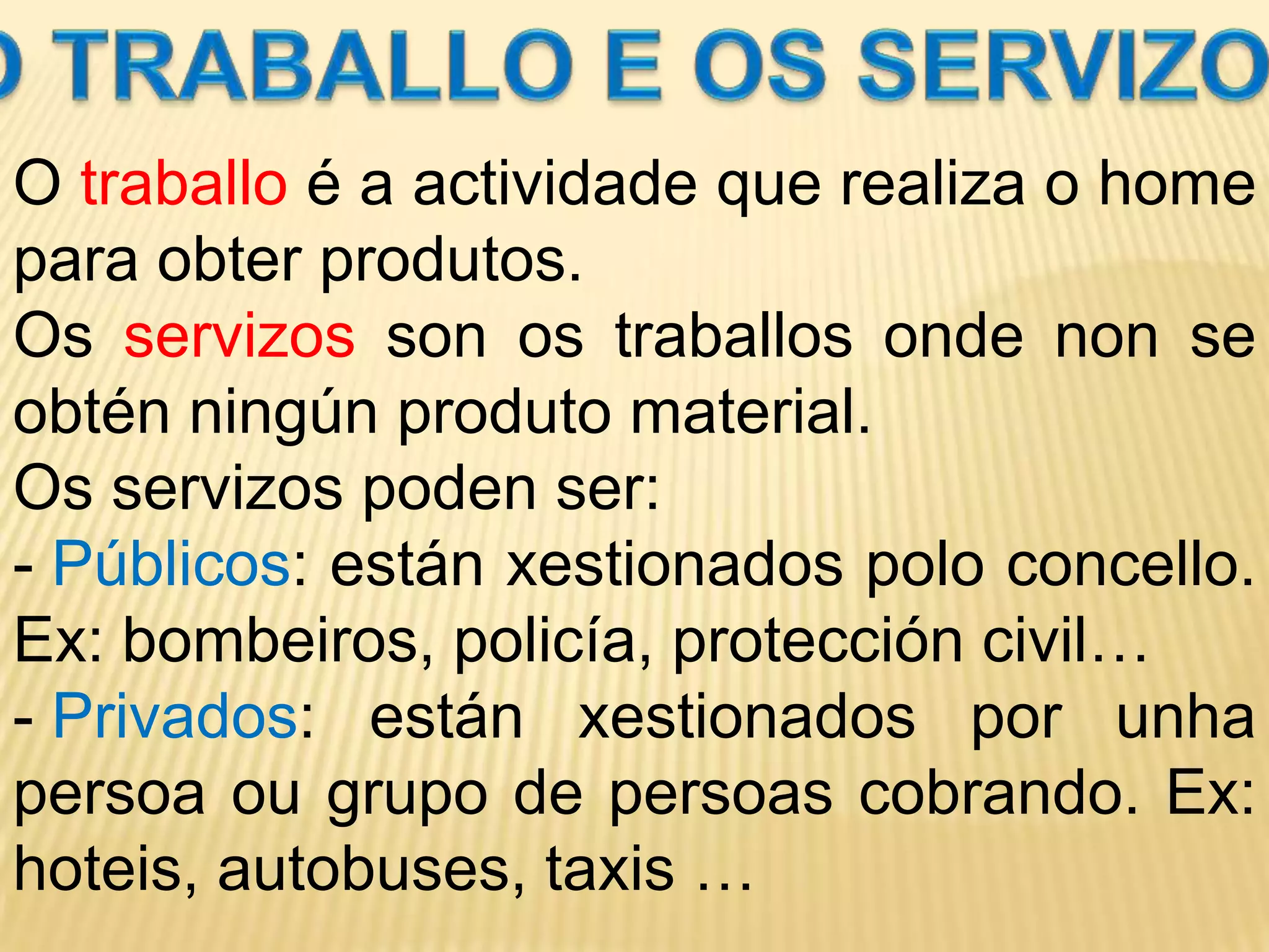 O TRABALLO EOS SERVIZOSO traballo é a actividade que realiza o home para obter produtos.Os servizos son os traballos onde non se obtén ningún produto material.Os servizos poden ser:Públicos: están xestionados polo concello. Ex: bombeiros, policía, protección civil…