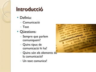 Introducció Definiu: ComunicacióText Qüestions: Sempre que parlem comuniquem? Quins tipus de comunicació hi ha? Quins són els elements de la comunicació? Un text comunica?