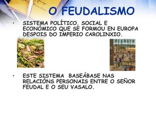 O FEUDALISMO SISTEMA POLÍTICO, SOCIAL E ECONÓMICO QUE SE FORMOU EN EUROPA DESPOIS DO IMPERIO CAROLINXIO. ESTE SISTEMA BASEÁBASE NAS RELACIÓNS PERSONAIS ENTRE O SEÑOR FEUDAL E O SEU VASALO.