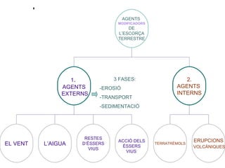 3 FASES: -EROSIÓ-TRANSPORT -SEDIMENTACIÓ AGENTS MODIFICADORS DE L’ESCORÇA TERRESTRE 1 . AGENTS EXTERNS 2. AGENTS INTERNS EL VENT L’AIGUA RESTES D’ÉSSERS VIUS ACCIÓ DELS ÉSSERS VIUS TERRATRÈMOLS ERUPCIONS VOLCÀNIQUES