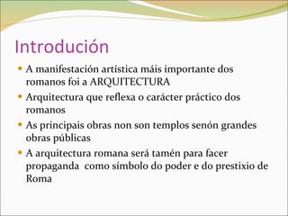 Introdución Amanifestación artística máis importante dos romanos foi a ARQUITECTURA Arquitectura que reflexa o carácter práctico dos romanos As principais obras non son templos senón grandes obras públicas A arquitectura romana será tamén para facer propaganda como símbolo do poder e do prestixio de Roma