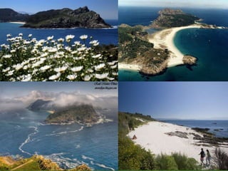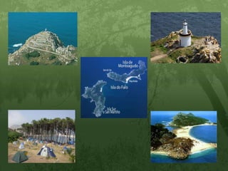Illa CíesOnde está? Situado na entrada da ría de Vigo en disposición norte-sur. Formado por tres illas: Monteagudo (Norte), do Faro (medio) e San Martiño (Sur) e una serie de illotes. Foron declaradas Parque Natural en 1980.Como chegar? Se accede en transporte marítimo dende Vigo, Baiona e Cangas do Morrazo dende Semana Santa ata o final do verán.Que podes ver? *Illa de Monteagudo atopamos o sistema dunar de Figueiras-Mixueiro. Dende el chégase ao Faro de Monteagudo o do Peito, onde hai un observatorio de aves. *Na illa do Faro se encontra a formación sedimentaria da praia de Rodas, que une as dúas illas, e o lago dos Nenos. *No sur, o Faro de Cíes, Faro da Porta e o pobo celta de Castro das Hortas. Os restos dun mosteiro fundado no Reino Galaico-Suevo (Sede do Centro de Interpretación)