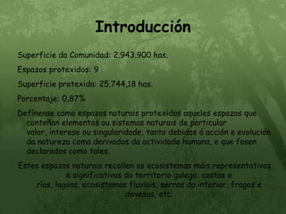 IntroducciónSuperficie da Comunidad:2.943.900 has.Espazos protexidos: 9Superficie protexida: 25.744,18 has.Porcentaje: 0,87%Defínense como espazos naturais protexidos aqueles espazos que conteñan elementos ou sistemas naturais de particular valor, interese ou singularidade, tanto debidos á acción e evolución da natureza coma derivados da actividade humana, e que fosen declarados como tales.Estes espazos naturais recollen os ecosistemas máis representativos e significativos do territorio galego: costas e rías, lagoas, ecosistemas fluviais, serras do interior, fragas e devesas, etc.