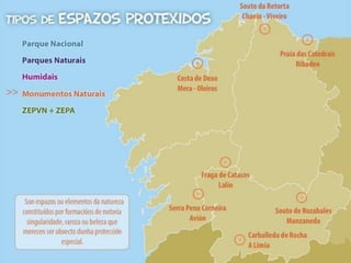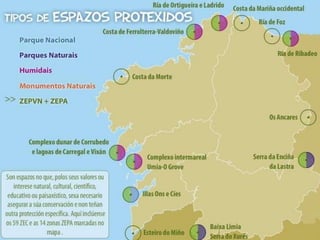 ZEPVN-LICA MarrondaA RamallosaAncares- CourelAs CatedraisBaixa LimiaBaixo MiñoBetanzos - MandeoBidueiral de MontederramoBrañas de XestosoCabo UdraCanón do SilCarnota - Monte PindoComplexo Ons - O GroveCosta da MorteCosta de DexoCosta ÁrtabraEncoro de Abegondo - CecebreEnseada de San SimónEstaca de BaresEsteiro do TambreFragas do EumeGándaras de BudiñoIllas CíesIllas EstelasMonte AloiaMonte Faro ETC.