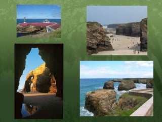 A praia dasCatedrais (Praia das Augas Santas)Situada no municipio de Ribadeo, na costa da provincia de Lugo sobre o mar Cantábrico. Ten un extenso sistema de furnas (covas mariñas), fumarolas, arcos e illotes. O nome da Praia das Catedrais vén da súa aparencia monumental, as súas arcadas e as formas que recordan á arquitectura das catedrais.Débese visitar en marea baixa, xa que coa marea alta é imposible visitala. Aínda que hai unha pasarela de madeira que lle permitirá visitar os puntos mais interesantes da costa.