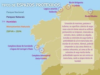 Os tipos dehumidais están agrupados en tres categorías: humidais mariños e costeiros, humidais continentais e humidais artificiais.O obxetivo do convenio é "a conservación e o uso racional dos humidais mediante accións locais, rexionais e nacionais e grazas á cooperación internacional, como contribución ao logro dun desenvolvemento sostible en todo o mundo”As Reservas da Biosfera, declaradas pola UNESCO.As reservas de biosfera constitúen lugares excepcionais para a investigación, a formación, a educación e a sensibilización do público, permitindo ao mesmo tempo que as comunidades locais participen (Home e Biosfera) Hay 4 en Galicia: área de Allariz, Terras do Miño, Entorno do río Eo e Os Ancares.