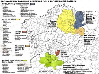 Área de Allariz(Reserva da Biosfera 2005)É unha das unidades xeográficas e territoriais mellor conformadas de toda Galicia. Nesta área discorren os río Limia e o río Arnoia.Posúe unha alta diversidade faunística, con especies de Interese Comunitario ou consideradas en perigo de extinción en España.A poboación non chega aos 10.000 habitantes. Está altamente concienciada respecto a un modelo de desenvolvemento sostible.Na Reserva existen paisaxes sobresaíntes, multitude de sitios arqueolóxicos romanos e prerromanos, con zonas de montañas de baixa altitude arborizadas e humidais de importancia.Conserva un dos paseos fluviais máis fermosos de Galicia. Del destaca o Parque Etnográfico cun muíño visitable e museos dedicados ao liño e ao coiro. É imperdible a visita ao dédalo de estreitas canellas en excelente estado de conservación da zona histórica