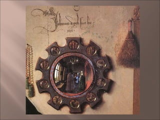 ESPELLO: circular con10 das 14 estacións do viacrucis. O espello mostra a estancia con outras dúas persoas: serían os testigos da boda BORLA : fertilidade STA MARGARITA: patroa dos partos Sobre as máns unha GÁRGOLA RIQUEZA DE ARNOLFINI: elementos luxosos na estancia, tanto na roupa como no moviliario, alfombra.