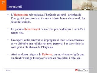 Introducci ó L’Humanisme reivindicava l’herència cultural i artística de l’antiguitat grecoromana i situava l’ésser humà al centre de les seves reflexions. La paraula Renaixement es va crear per evidenciar l’inici d’un temps nou. Un esperit crític renovat va impregnar el món de les creences: es va difondre una religiositat més personal i es va criticar la corrupció i els abusos de l’Església. Això va donar origen a la Reforma , un moviment religiós que va dividir l’antiga Europa cristiana en protestant i catòlica. 07