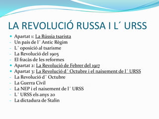 Apartat 1. LARÚSSIA TSARISTA: el fracàs de les reformesLes reformes aplicades pel tsar per sufocar l´ anomenada “Revolució del 1905” van ser un fracàs per cinc motius:El Parlament (la “Duma”) no tenia cap poder de decisió; el tsar Nicolau II continuava exercint el poder de manera autoritària.La “Reforma Agrària” del 1906 no va funcionar. Consistia en repartir terres els pagesos, però només uns pocs es van beneficiar (els “kulaks” o pagesos enriquits). La majoria de les terres continuaven en mans de l´ Església i la noblesa.La greu repressió política va provocar l´ odi del poble al tsar: 40.000 persones van ser executades per raons polítiques.La popularitat de la família del tsar encara baixa més per la presència d´ un estrany “conseller del tsar”, Rasputín(“l´ Home Sant”).Però sens dubte, la principal causa de la Revolució del 1917 va ser la participació de Rússia a la Primera Guerra Mundial (1914-1918)