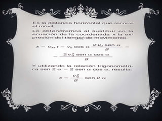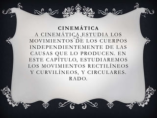 This document discusses kinematics, which is the study of motion without considering its causes. It will examine rectilinear, curved, and circular motions. It describes two simulated practices involving rectilinear motion - determining the constant velocity of an object and determining the acceleration of an object in uniform accelerated motion. It also discusses parabolic motion, which corresponds to the ideal trajectory of a projectile moving in a medium without resistance under a uniform gravitational field, though in reality the motion is elliptical due to Earth's gravitational field. However, the trajectory is close enough to a parabola to calculate using the parabolic equation.