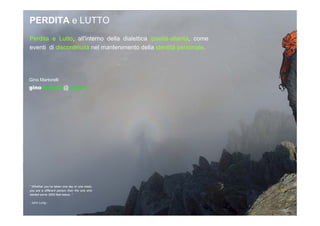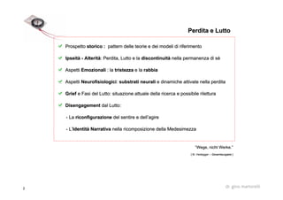 Il documento di Gino Martorelli analizza il tema della perdita e del lutto in relazione all'identità personale, evidenziando la dialettica tra ipseità e alterità come fattori di discontinuità. Viene esaminato come vari modelli teorici, da Freud a Bowlby, affrontano le emozioni connesse alla perdita e alla ricomposizione dell'identità attraverso il lutto. La riflessione si concentra anche sulla connessione ontologica tra il sé e l'altro, sottolineando l'importanza degli incontri emotivi nella nostra esperienza di vita.