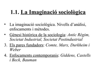 1.1. LaImaginació sociològica La imaginació sociològica. Nivells d’anàlisi, enfocaments i mètodes. Gènesi històrica de la sociologia : Antic Règim, Societat Industrial, Societat Postindustrial 3. Els pares fundadors : Comte, Marx, Durkheim i Weber 4. Enfocaments contemporanis : Giddens, Castells i Beck, Bauman