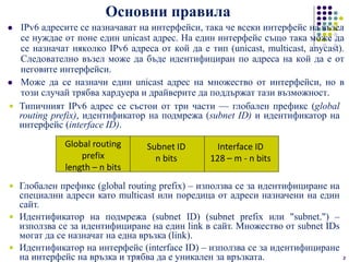 routing prefix), идентификатор на подмрежа (subnet ID) и идентификатор на