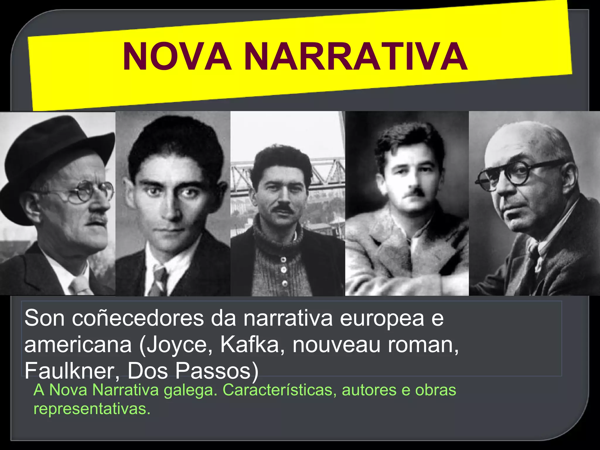 Son coñecedores danarrativa europea e americana (Joyce, Kafka, nouveau roman, Faulkner, Dos Passos) NOVA NARRATIVA A Nova Narrativa galega. Características, autores e obras representativas.