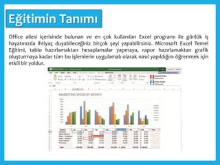 Office ailesi içerisinde bulunan ve en çok kullanılan Excel programı ile günlük iş hayatınızda ihtiyaç duyabileceğiniz birçok şeyi yapabilirsiniz. Microsoft Excel Temel Eğitimi, tablo hazırlamaktan hesaplamalar yapmaya, rapor hazırlamaktan grafik oluşturmaya kadar tüm bu işlemlerin uygulamalı olarak nasıl yapıldığını öğrenmek için etkili bir yoldur.