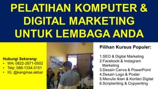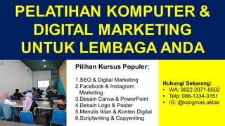 Pelatihan Digital dan Desain Berkualitas untuk Lembaga Anda Kini Hadir di Wilayah Indonesia Timur! Kursus komputer dan digital marketing langsung dari trainer profesional – Muhammad Akbar Rabbani, Malang, Jawa Timur. Siapa Kami? Saya, Muhammad Akbar Rabbani, adalah seorang trainer komputer profesional yang memberikan pelatihan praktis dan aplikatif untuk lembaga Anda: - Sekolah & Universitas - Yayasan & Lembaga Sosial - Instansi Pemerintah - Perusahaan & Organisasi Swasta Area layanan: Papua, Papua Barat, Maluku, Maluku Utara, Sulawesi Barat, NTB, NTT, Aceh, Sulawesi Tengah, Gorontalo Pilihan Kursus Unggulan: 1. Digital Marketing & Pemasaran Online - Kursus SEO - Kursus Facebook Marketing - Kursus Instagram Marketing - Kursus Internet Marketing - Kursus Digital Marketing - Kursus Jualan Online - Kursus Pemasaran Online - Kursus Bisnis Online - Kursus Social Media Marketing 2. Desain Grafis & Presentasi - Kursus Desain Canva - Kursus Desain PowerPoint - Kursus Desain Logo - Kursus Desain Poster 3. Penulisan & Konten Digital - Kursus Copywriting - Kursus Content Writing - Kursus Menulis Iklan - Kursus Scriptwriting - Kursus Menulis Kreatif - Kursus Membuat Konten Mengapa Memilih Kami? - Trainer profesional - Materi disesuaikan dengan kebutuhan lembaga - Sertifikat pelatihan untuk peserta - Pendekatan aplikatif & mudah dipahami Pelatihan Siap Pakai | Hasil Nyata | Fokus pada Praktik Langsung Muhammad Akbar Rabbani – Trainer Kursus Komputer Profesional dari Malang, Jawa Timur Hubungi Kami Sekarang! Kami siap datang ke lokasi lembaga Anda di wilayah Indonesia Timur. - WhatsApp: 0822-2871-0502 - Telepon: 088-1334-3151 - Instagram: @kangmas.akbar Kursus Komputer NTT Belu, Kursus Komputer NTT Atambua, Kursus Komputer NTT Ende, Kursus Komputer NTT Flores Timur, Kursus Komputer NTT Larantuka, Kursus Komputer NTT Kupang, Kursus Komputer NTT Oelamasi, Kursus Komputer NTT Lembata, Kursus Komputer NTT Lewoleba, Kursus Komputer NTT Malaka, Kursus Komputer NTT Betun, Kursus Komputer NTT Manggarai, Kursus Komputer NTT Ruteng