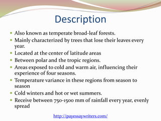 Temperate deciduous forests, characterized by trees that shed leaves annually, are primarily found in regions between polar and tropic areas and experience four distinct seasons with a range of temperatures. These forests support diverse flora and fauna, including various tree species and wildlife adapted to seasonal changes, but they face threats from human activity and climate change, resulting in diminishing habitats. The economic significance of these forests includes biodiversity, recreational opportunities, and resources for lumber and herbal medicine.