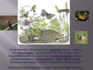 This document provides lists of animals found in various regions including Africa, Australia, South America, and Eurasia. It also describes the habitats and diets of several small creatures including centipedes, earwigs, moles, ground beetles, and woodmice. Centipedes and earwigs like dark, damp places and eat small creatures or dead plant materials. Moles have strong front legs for digging tunnels underground and have small eyes, eating worms and insects. Ground beetles live under stones and logs, hunting at night. Woodmice can move quickly and make underground tunnels, feeding on insects and spiders.
