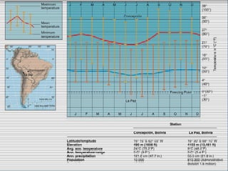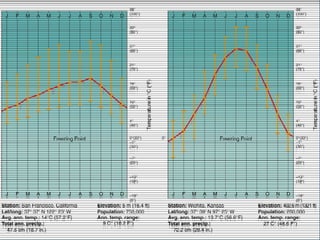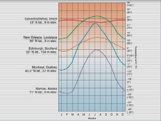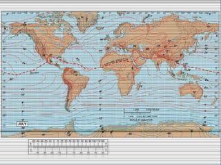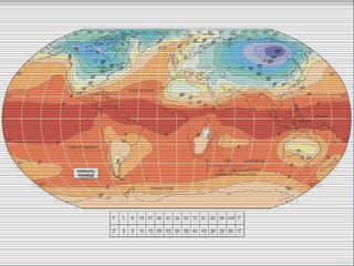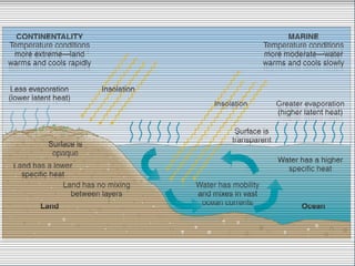 The document discusses temperature concepts, controls, and global patterns. It defines temperature and explains how it is measured. The key controls of temperature are latitude, altitude, clouds, continents and oceans. Globally, temperature patterns show higher ranges over continents and lower ranges near oceans due to their moderating effects, with the thermal equator shifting north in summer.