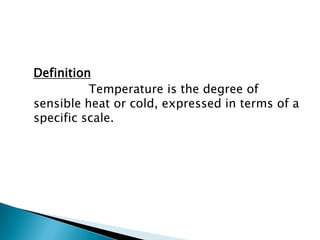 Temperature is a measurement of heat or cold expressed on a scale, with the most common scales being Celsius, Fahrenheit, and Kelvin. Celsius uses 0°C as the freezing point of water and 100°C as the boiling point. Fahrenheit uses 32°F and 212°F as these points. Kelvin uses 0K as absolute zero. Normal human body temperature is around 37°C or 98.6°F measured orally. Temperature is regulated by the hypothalamus and can be influenced by factors like exercise, age, and menstruation. Elevated temperature is a fever while lowered temperature is hypothermia.