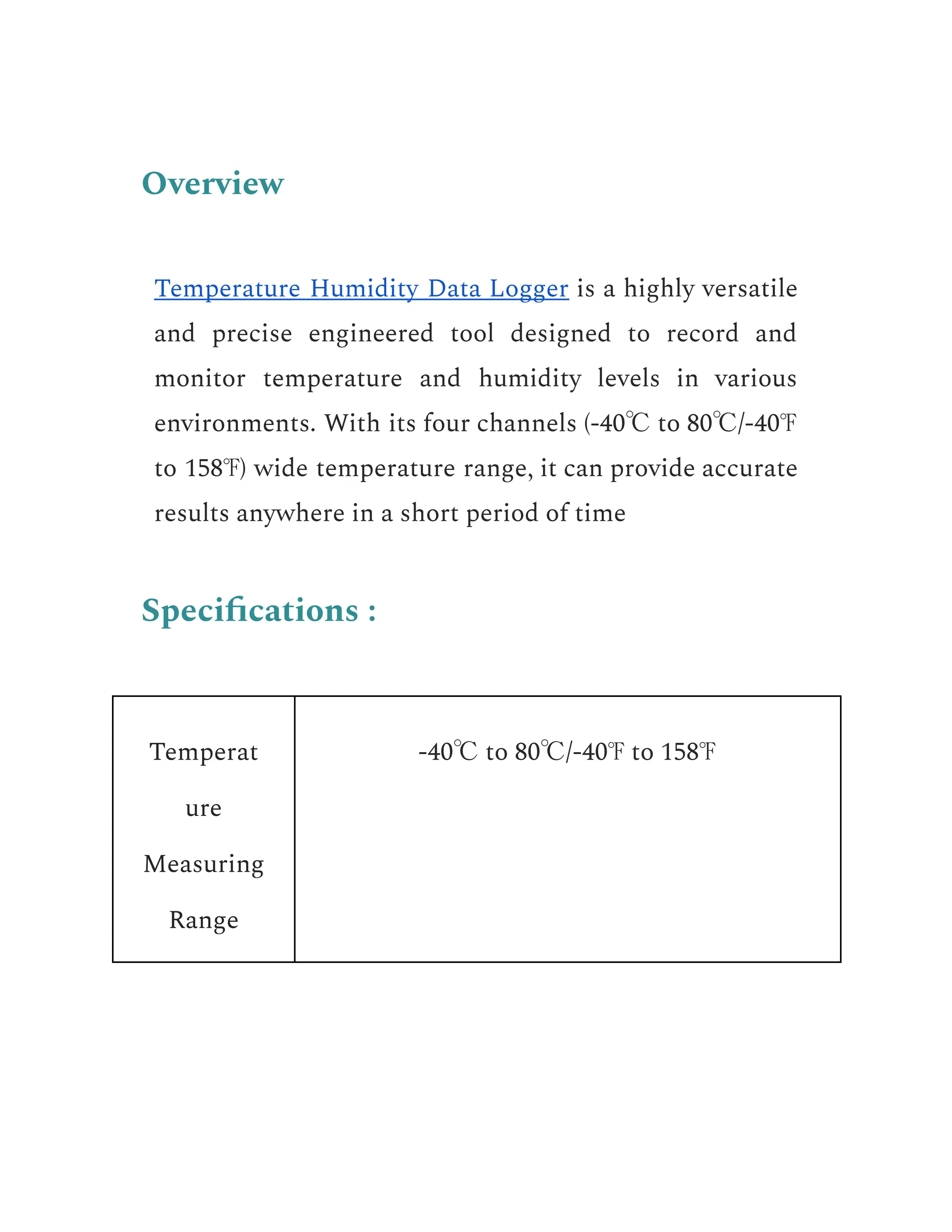 The temperature and humidity data logger is a precise device designed to monitor environmental conditions across a wide temperature range from -40°C to 80°C. It features multiple sensors, alarm modes, and wireless connectivity for real-time data transmission and remote monitoring. This device is suitable for applications in various fields, including medical, industrial, and environmental monitoring.