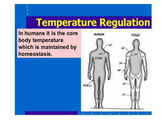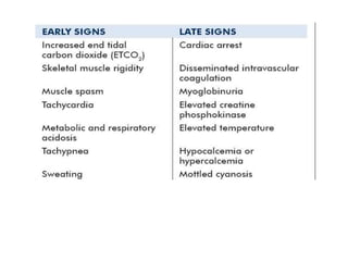 The document discusses temperature management in surgical patients. It covers normal body temperature, factors that can alter temperature, thermoregulatory responses to heat and cold, and classifications of hypothermia and hyperthermia. It also summarizes complications of hypothermia, prevention and treatment of intraoperative hypothermia, malignant hyperthermia, and management of hyperthermia and fever.