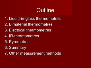 This document discusses various methods for temperature measurement. It describes liquid-in-glass thermometers, which measure temperature based on the expansion of liquid in a glass bulb. Electrical thermometers are also discussed, including resistive thermometers made of materials like platinum and nickel, as well as thermistors. Infrared thermometers measure the thermal radiation emitted by objects based on properties like Planck's law and Wien's law. Other methods mentioned include bimetal thermometers, pyrometers, and more.