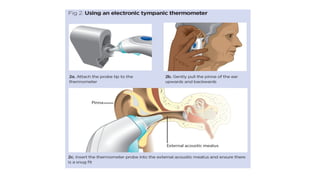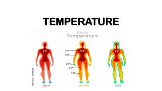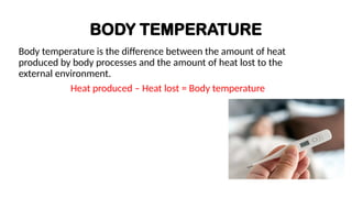 The document provides an overview of body temperature regulation, emphasizing the balance between heat production and loss, which is controlled mainly by the hypothalamus through physiological and behavioral mechanisms. It discusses factors affecting body temperature, including age, exercise, hormonal fluctuations, and environmental conditions, as well as methods for measuring temperature across different sites and devices. Additionally, it addresses the significance of temperature assessment in diagnosing health conditions and outlines the proper care for thermometers.