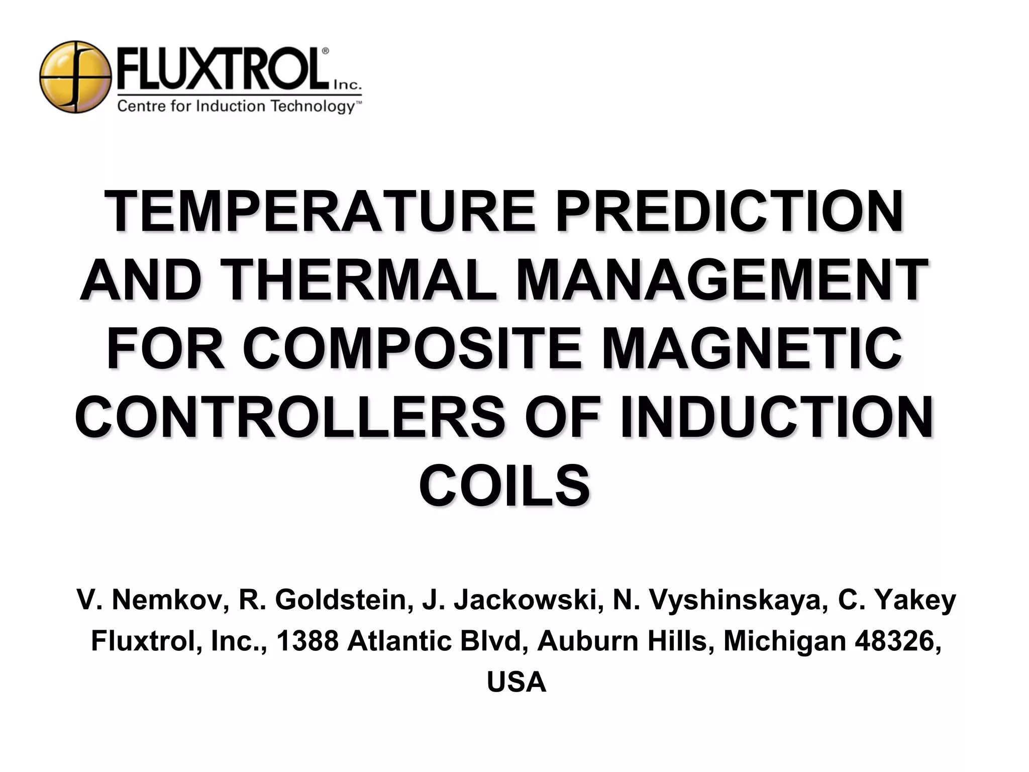 The document discusses the development and application of composite magnetic controllers for induction coils, particularly highlighting the new material Fluxtrol 75 which has enhanced thermal conductivity. It emphasizes the importance of temperature prediction and management in maintaining reliable inductor performance, detailing methods for thermal control. Additionally, the document presents simulation techniques for predicting temperature distribution and the benefits of internal cooling in preventing overheating.
