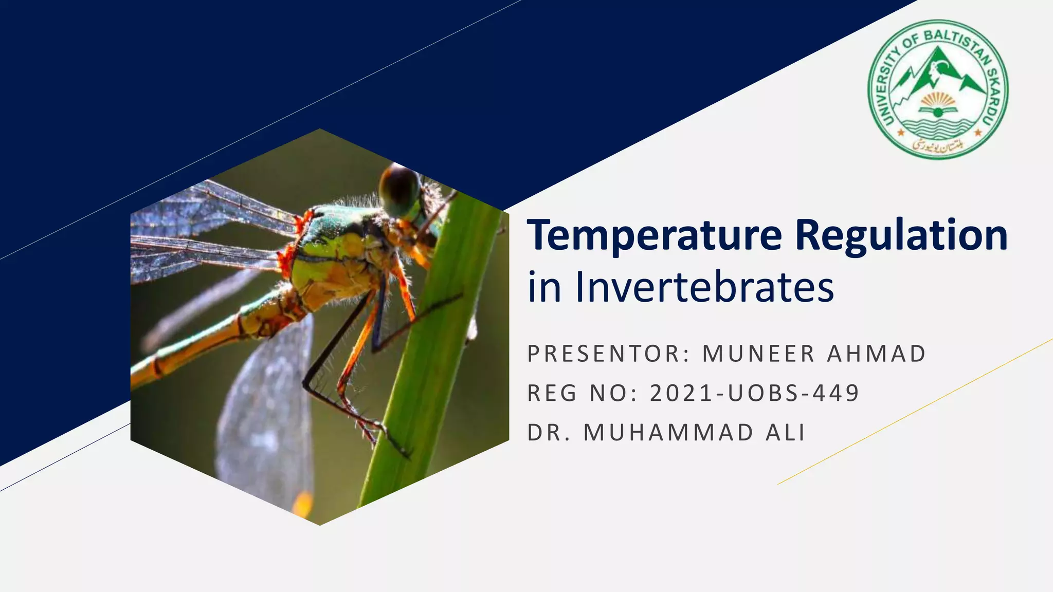 This document discusses temperature regulation in invertebrates. It notes that many invertebrates passively conform to the temperature of their environment as they lack mechanisms for thermoregulation. Some higher invertebrates can sense temperature differences. Many arthropods like insects and crustaceans can sense thermal variation, such as ticks detecting warmth from nearby hosts. Some invertebrates regulate temperature through processes like reducing water content to avoid freezing, producing antifreeze compounds, or shivering muscles to warm up. Larger flying insects prevent overheating by circulating heat through their bodies. Certain desert-dwelling cicadas and beetles have evolved evaporative cooling and wax blooms respectively to regulate temperature.