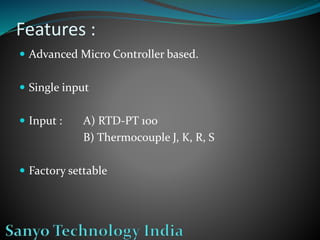 This document describes a temperature transmitter that uses an advanced microcontroller to measure temperature from RTD or thermocouple sensors. It provides automatic cold junction compensation for thermocouples, has 0.5% accuracy for thermocouples and 0.2% accuracy for PT-100 RTDs, and outputs a 4-20mA signal proportional to the temperature through a current loop with up to 600 ohm load capacity. The transmitter can be head or DIN rail mounted and operates on a 12-36VDC power supply.