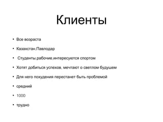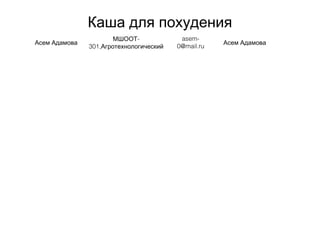 Документ описывает кашу для похудения, разработанную Ассемом Адамовым, и ее целевую аудиторию в Казахстане. Основные проблемы клиентов включают ожирение, недостаток мотивации и финансовые трудности, а продукт обещает помочь в похудении. Каша предназначена для людей всех возрастов, включая студентов и рабочих, стремящихся к успеху и лучшему будущему.