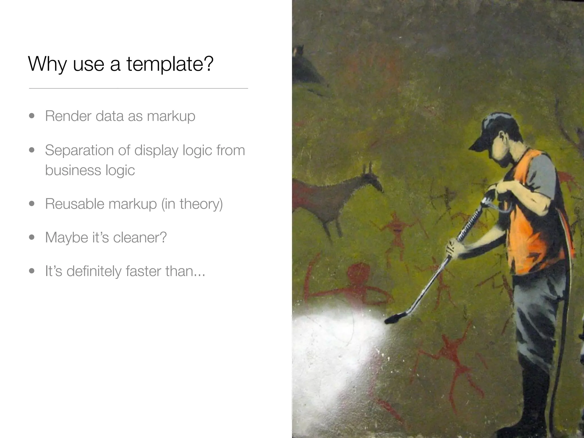 The document discusses JavaScript templating libraries and jQuery's $.template plugin. It explains that templates allow separation of display logic from business logic and reusable markup. $.template converts a string into a function that renders data as HTML/DOM. Tags like {%= %} output values and {% %} execute JavaScript without output. Templates can take string, DOM, or Ajax input and output as a function, DOM fragment, or HTML string.