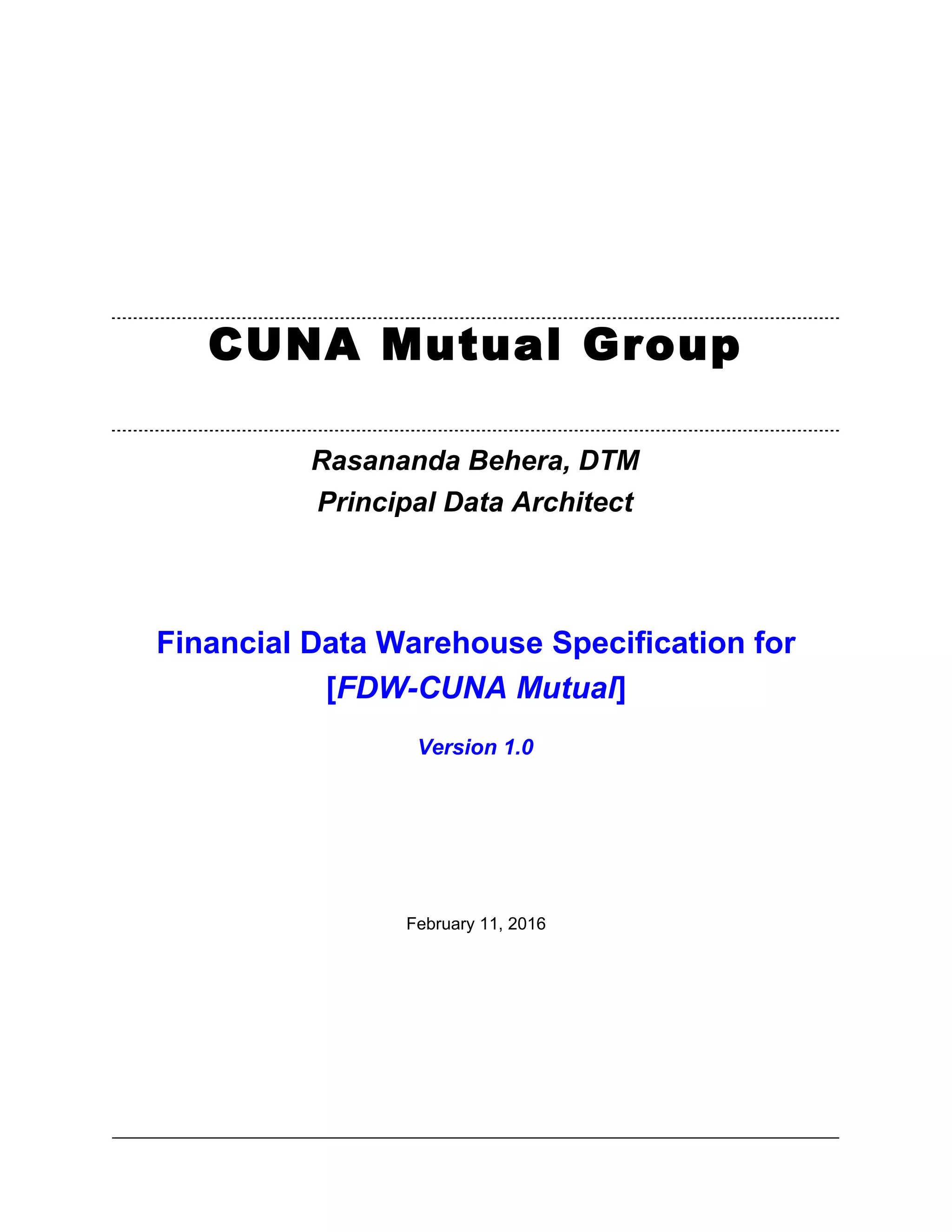 This document provides a template for specifying requirements for a financial data warehouse project. The template includes sections for introducing the project, stating its purpose and objectives, defining requirements, and considering constraints. The document was created by Rasananda Behera on February 11, 2016 as a version 1.0 template for financial data warehouse specification documents.