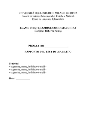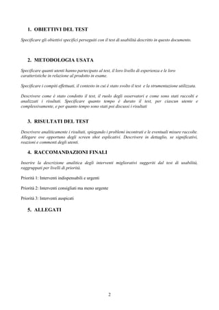 Il documento descrive un rapporto di test di usabilità condotto da studenti nell'ambito di un corso di laurea in informatica. Vengono specificati gli obiettivi del test, la metodologia, i risultati ottenuti e le raccomandazioni finali suddivise per livelli di priorità. Infine, il documento accenna alla presenza di allegati e screenshot esplicativi.