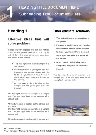 The document contains sample placeholder text that can be replaced. It instructs the user to click on the sample text and paste their own text instead, and their text will take on the same formatting as the sample. Sections are titled with headings like "Offer efficient solutions" and "Indicate and discuss how solutions will influence the situation". Placeholder lists and paragraphs are included throughout for the user to replace with their own customized text.