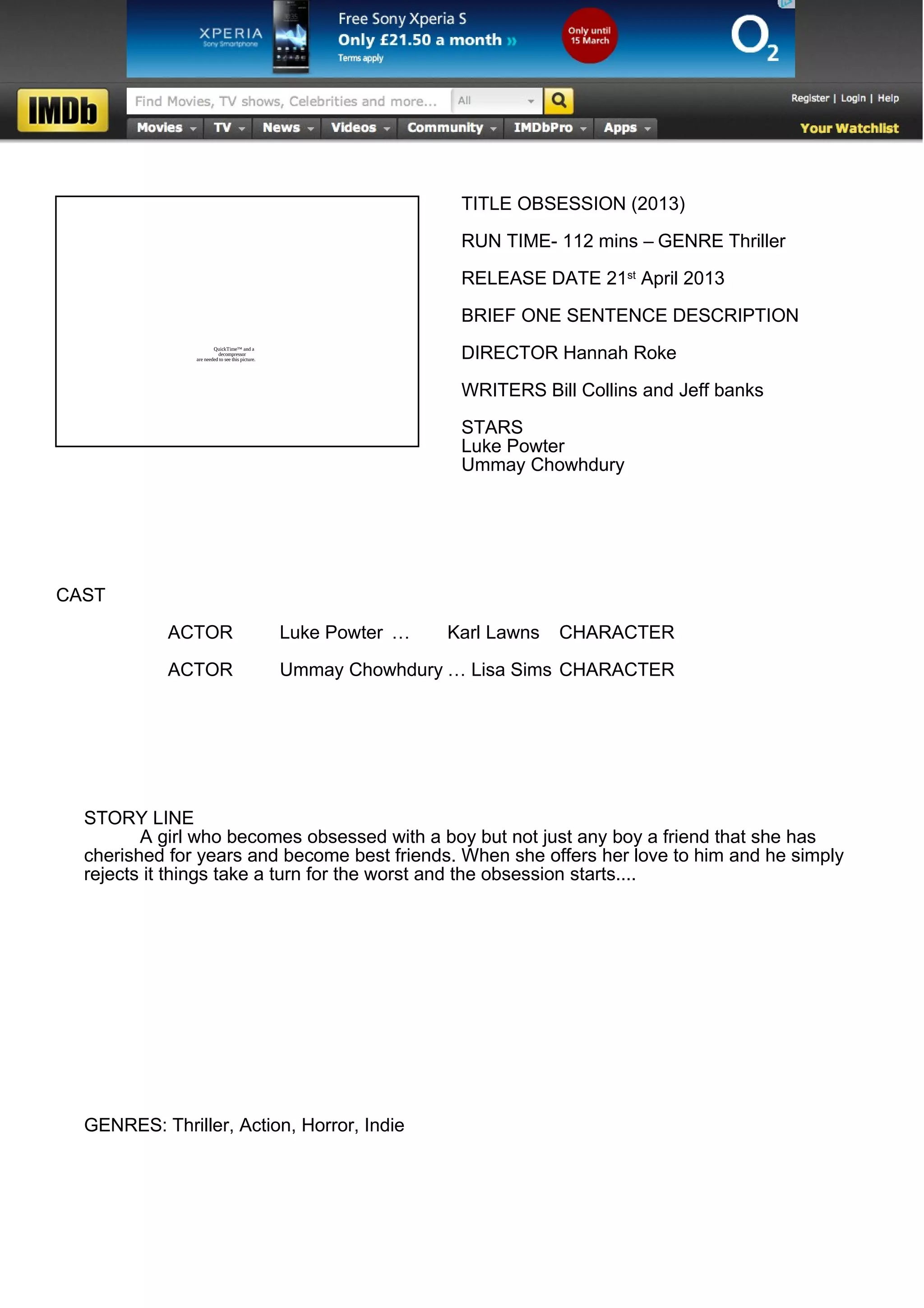 The 2012 thriller film "Title Obsession" directed by Hannah Roke tells the story of a girl, played by Ummay Chowdhury, who becomes obsessed with her best friend, played by Luke Powter, after he rejects her romantic feelings. Filmed in Cambridge, UK on a small budget, the 112-minute movie explores the dark consequences of her unhealthy obsession.