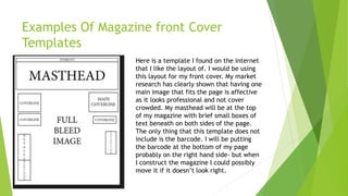 Sophie Canning provides examples of templates she found online for different sections of her magazine, including the front cover, contents page, and double page spreads. For the front cover template, she likes that it features a large central image and will add the barcode to the bottom. She also provides an example contents page from a music magazine that she will adapt, which features a large image with text alongside. Finally, for her double page spread she details using a large image on the right with a quote and interview text filling most of the left page.