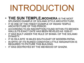 The Sun Temple at Modhera was built in 1026-27 AD under the Solanki dynasty. It is dedicated to the sun god Surya and was designed so that sunlight would illuminate the deity's image at the equinoxes. The temple complex includes a large sacred pool and the main temple, divided into a pillared hall and inner sanctuary. Though now in ruins, the temple was renowned for its intricate carvings covering every surface both inside and out.