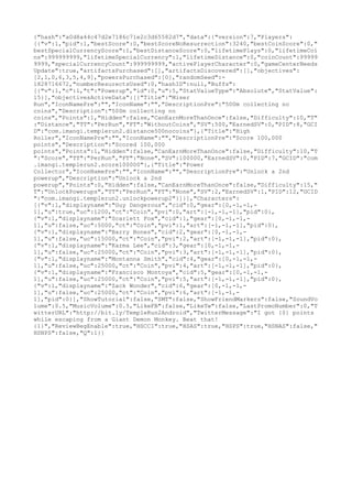 The document contains player data for a Temple Run 2 game including the player's best scores, currencies collected, objectives completed, available characters, and game settings. It lists the player's top score of 3240 points without resurrections and describes three active objectives including collecting 500 meters without coins, scoring 100,000 points, and unlocking a second powerup.