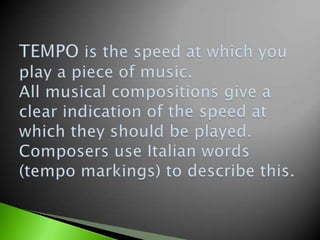 This document provides tempo markings and their meanings used in music. It lists common tempo markings like grave, adagio, allegro and their speed such as very slow, slow, fast. It also includes words to modify the tempo like molto for very and poco for little. Additionally, it outlines terms to gradually speed up or slow down the tempo and words for playing freely or at pleasure.