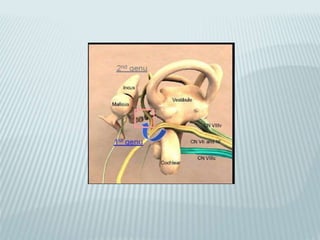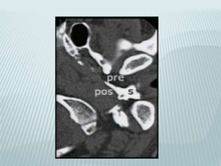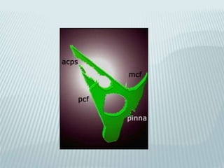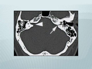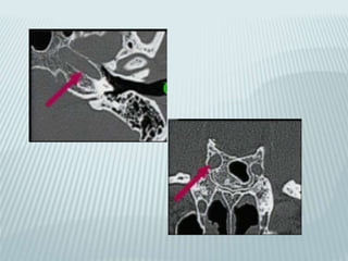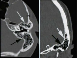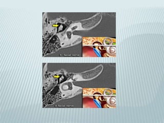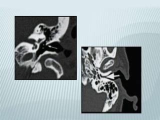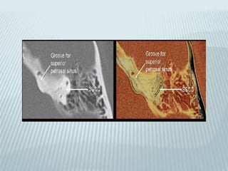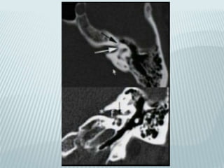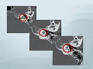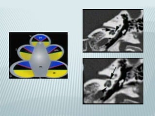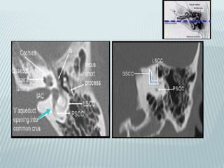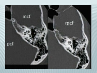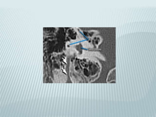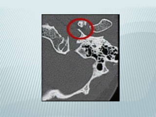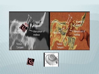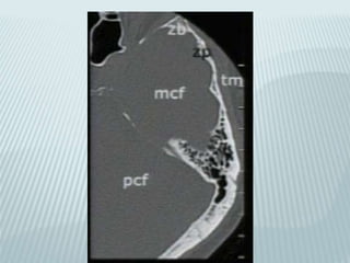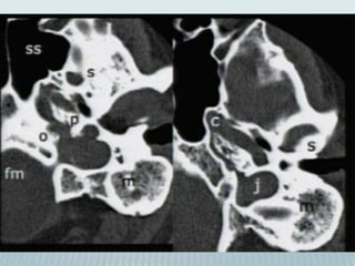 This document provides a detailed overview of CT imaging and anatomy of the temporal bone. It describes the CT imaging protocol used, including axial and coronal views. It then reviews the anatomy of each segment of the temporal bone - squamous, mastoid, petrous, tympanic and styloid. For the petrous segment, it describes the subsegments and key structures like the internal acoustic meatus. It reviews the anatomy of the outer, middle and inner ear, including structures like the cochlea and semicircular canals. Pathologies affecting the temporal bone like otitis externa and cholesteatoma are also summarized.