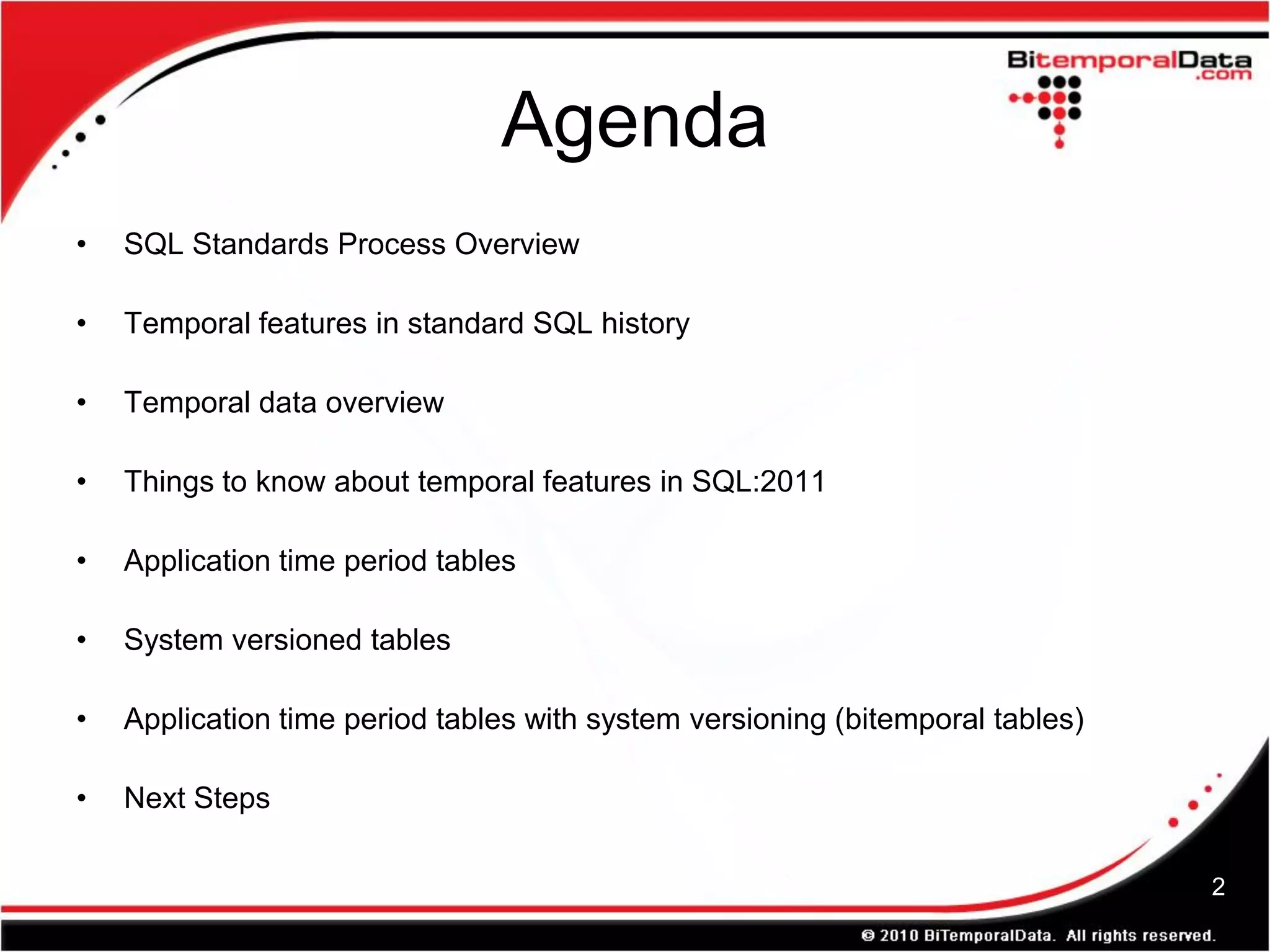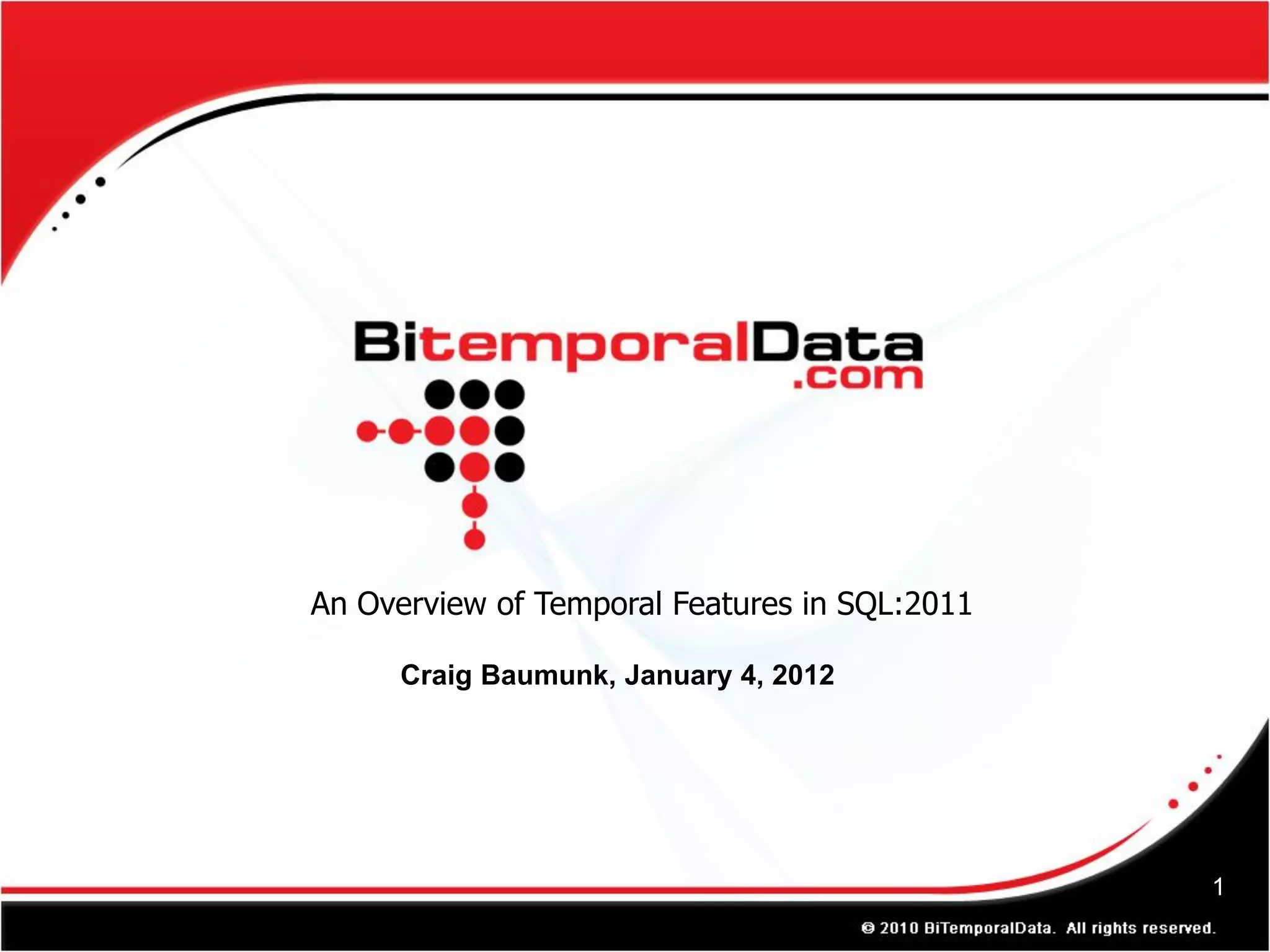 The document provides an overview of the temporal features introduced in SQL:2011, including system-versioned and application-time period tables, and the standards process that led to their inclusion. It highlights the evolution of temporal data handling in SQL from its initial proposal in the 1990s to its eventual adoption in 2011, emphasizing the complexities of temporal data such as application and system time. The document concludes with considerations for future utilization and vendor adoption of these new SQL capabilities.