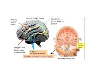 The temporal lobes are located inside the temples on both sides of the brain. They are divided into superior, middle, and inferior temporal lobes. The temporal lobes are involved in auditory processing, language comprehension, visual recognition, memory formation, and emotional processing. Disorders of the temporal lobes can cause issues with auditory and visual perception, attention, memory, language, personality, and behavior. The amygdala and hippocampus, located within the medial temporal lobes, are important for processing emotions and forming memories.