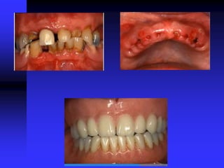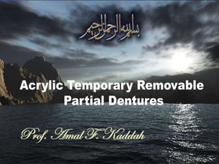 Temporary removable partial dentures are used for a limited period of time until a more definitive prosthesis can be provided. They serve several objectives like reestablishing esthetics, maintaining space, improving patient tolerance, and conditioning tissues. Some common types of temporary RPDs include interim, transitional, treatment, and immediate RPDs. Acrylic partial dentures are lightweight alternatives to metal partial dentures that are less expensive and easier to construct but also weaker and less hygienic. Their design incorporates acrylic resin, acrylic teeth, and wire clasps.