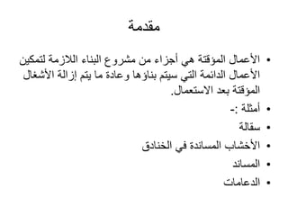 تناقش الوثيقة تفاصيل الأعمال المؤقتة في البناء، بما في ذلك أنواعها مثل السقالات والمساند والخنادق. تسلط الضوء على طرق دعم العمل المؤقت وضرورة استخدام المواد المختلفة في إنشاء المشاريع. كما تشير إلى أهمية التخطيط والتنظيم في مواقع العمل لضمان سلامة المشاريع وجودتها.