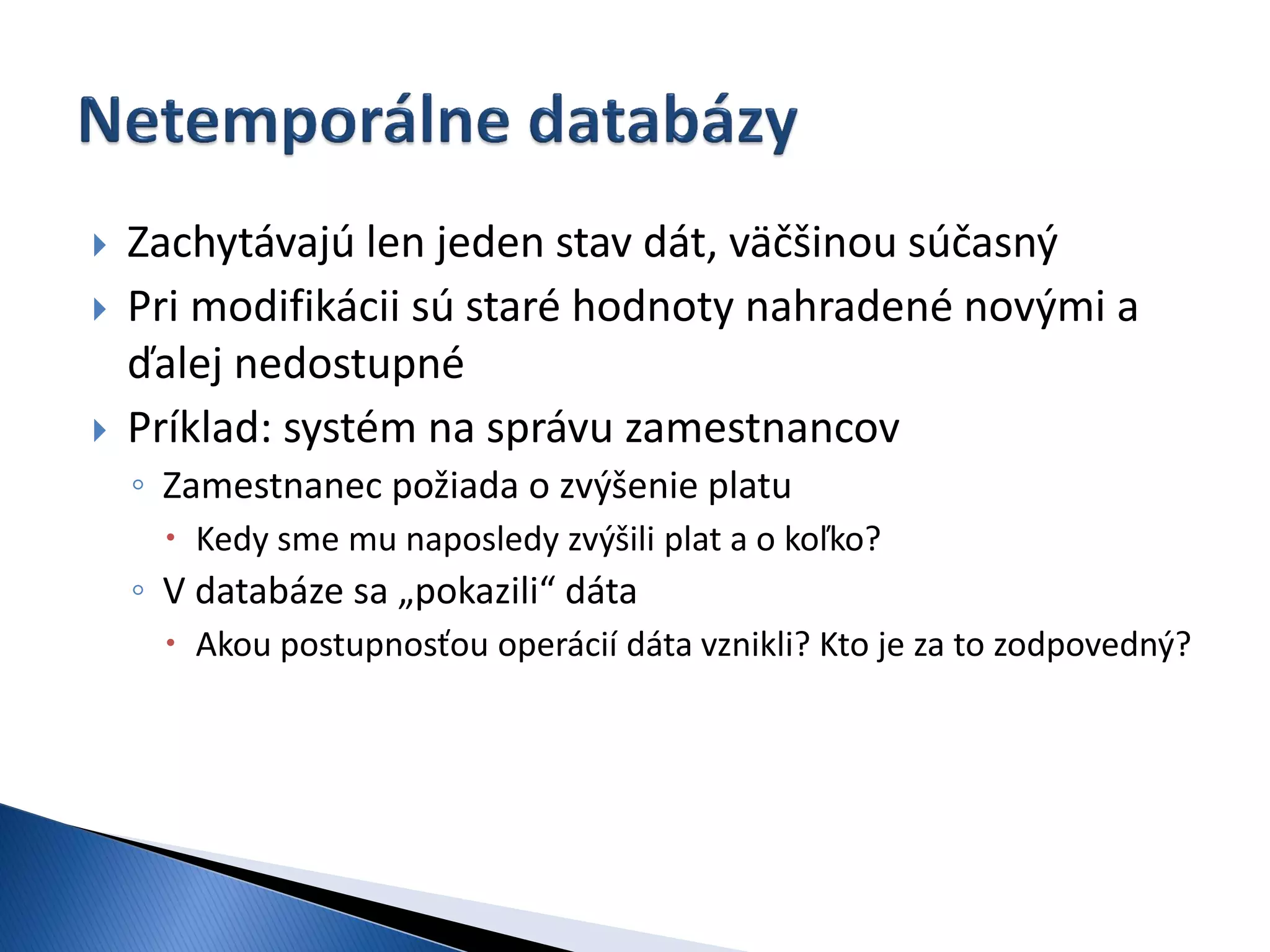 Temporálne databázy umožňujú zachytávať históriu biznisových a systémových zmien dát a poskytujú prostriedky na pohodlnú prácu s historickými dátami. Majú široké uplatnenie v rôznych sektoroch ako napríklad poisťovníctvo, bankovníctvo či rezervačné systémy. Umožňujú jednoduché kontrolovanie vykonaných zmien, návrat k predchádzajúcim stavom dát a rôzne analytické dotazy nad históriou. V rámci prezentácie sa budem venovať všeobecnému prehľadu oblasti, existujúcim štandardom (napr. SQL:2011) a riešeniam a na jednoduchých príkladoch predvediem hlavnú funkcionalitu temporálnych databáz. Nakoniec ešte načrtnem možnosti pridania temporálnej podpory do Postgresql a porozprávam aj o tom, ako sa snažím temporálnu podporu dostať do oficiálneho release a čo všetko také niečo obnáša.