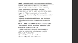 The document summarizes the anatomy and movements of the temporomandibular joint (TMJ). It describes the bony components, articular disc, ligaments, muscles, blood supply, and nerve supply of the TMJ. It also discusses the different types of mandibular movements including hinge, protrusive, retrusive, and lateral movements as well as habitual movements like speech, mastication, and deglutition. The TMJ allows hinging and gliding movements of the mandible for functions like eating and talking.